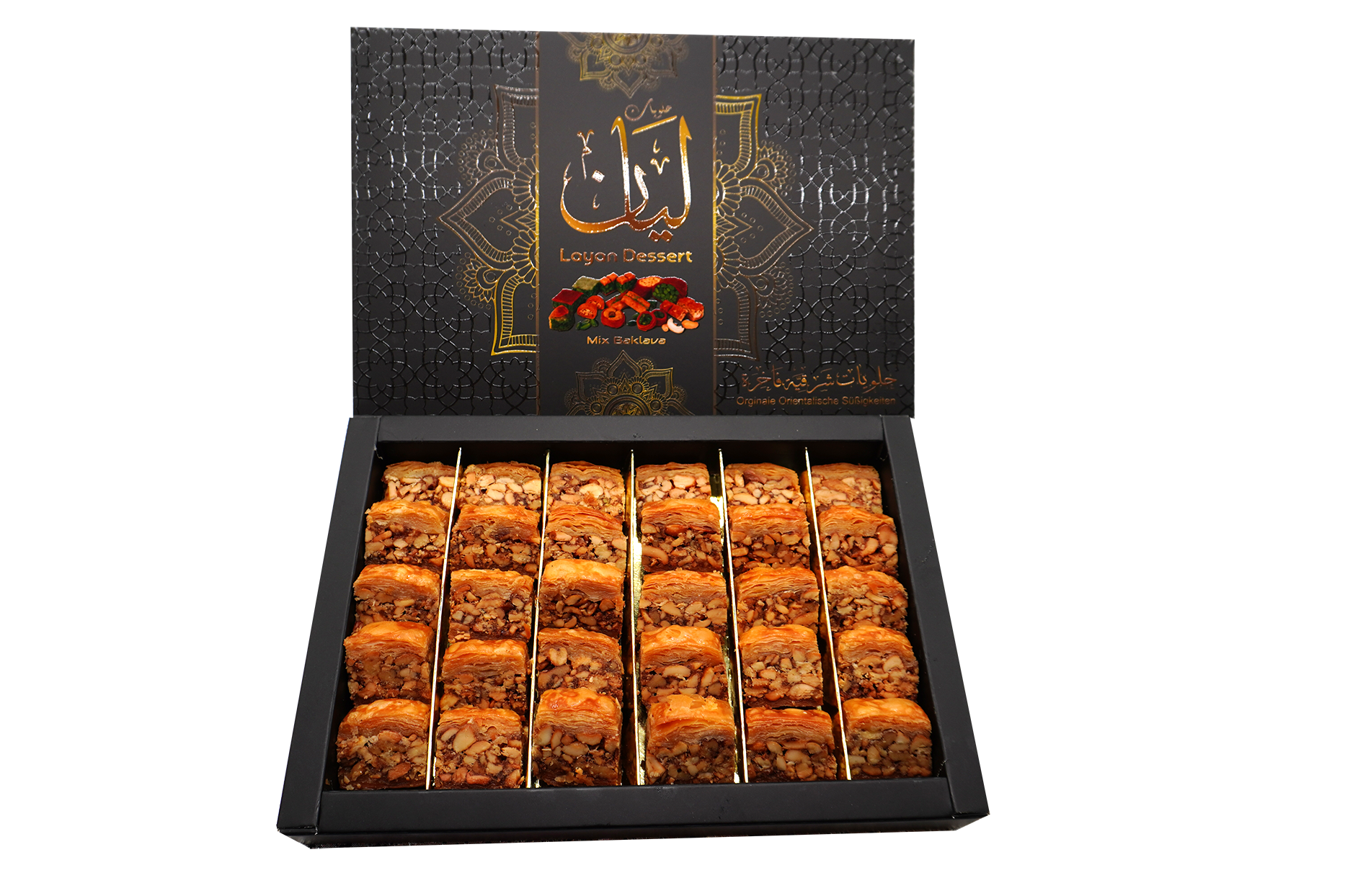 Zutaten: Weizenmehl, Wasser, Nüsse, Zucker, Butter Ghee, Milch, Stärke, Rosenwasser Orangenblütenwasser.